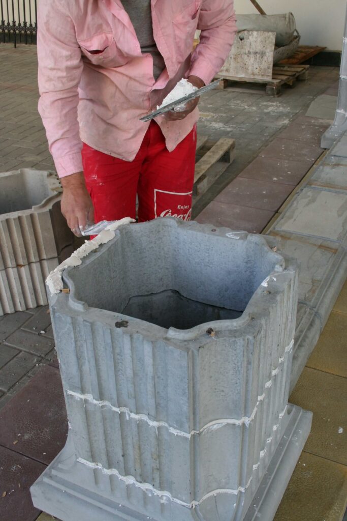 Ширина сборной колонны от Политеп доступна в двух размерах – 38х38 и 50х50 см, при этом высота и оттенки деталей легко регулируются. Сама конструкция состоит из нескольких элементов: